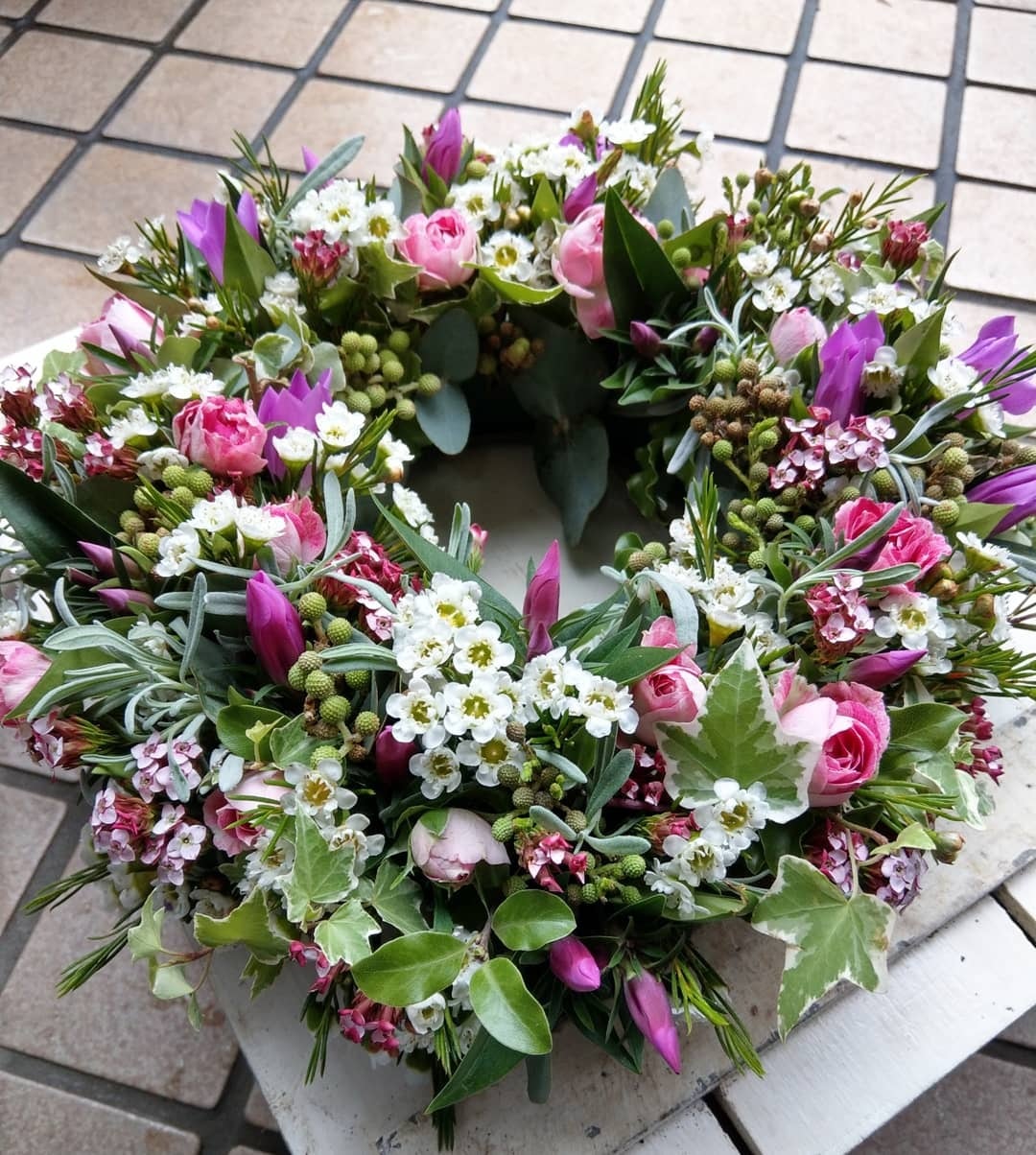 季節のフレッシュな花を使って英国式テーブルリースをお作り致します。